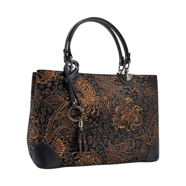 Geanta Belle Monique BM185 impresionează prin eleganța sa naturală și detaliile artistice atent lucrate. Realizată din piele naturală de înaltă calitate, acest model italian se remarcă prin imprimeul floral rafinat și textura plăcută la atingere, oferind un echilibru perfect între stil, confort și funcționalitate.